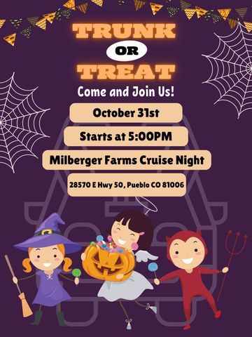 Dress the kids up and come out for some Trunk or Treating. Great night to enjoy cool cars.